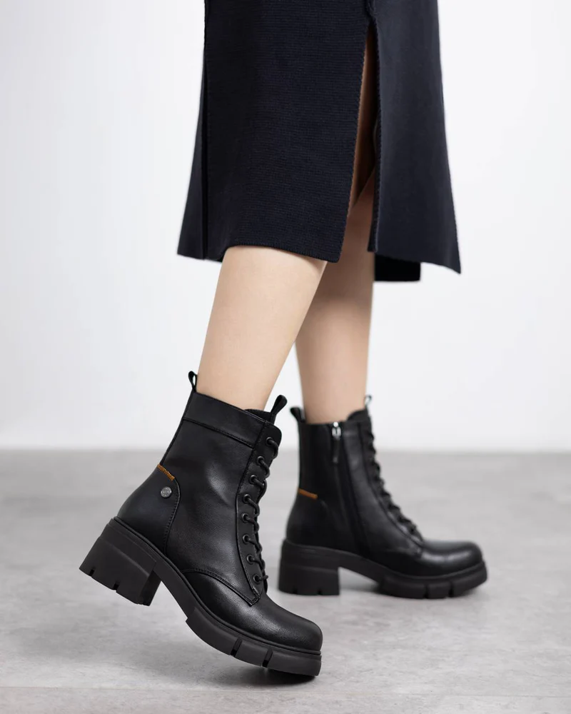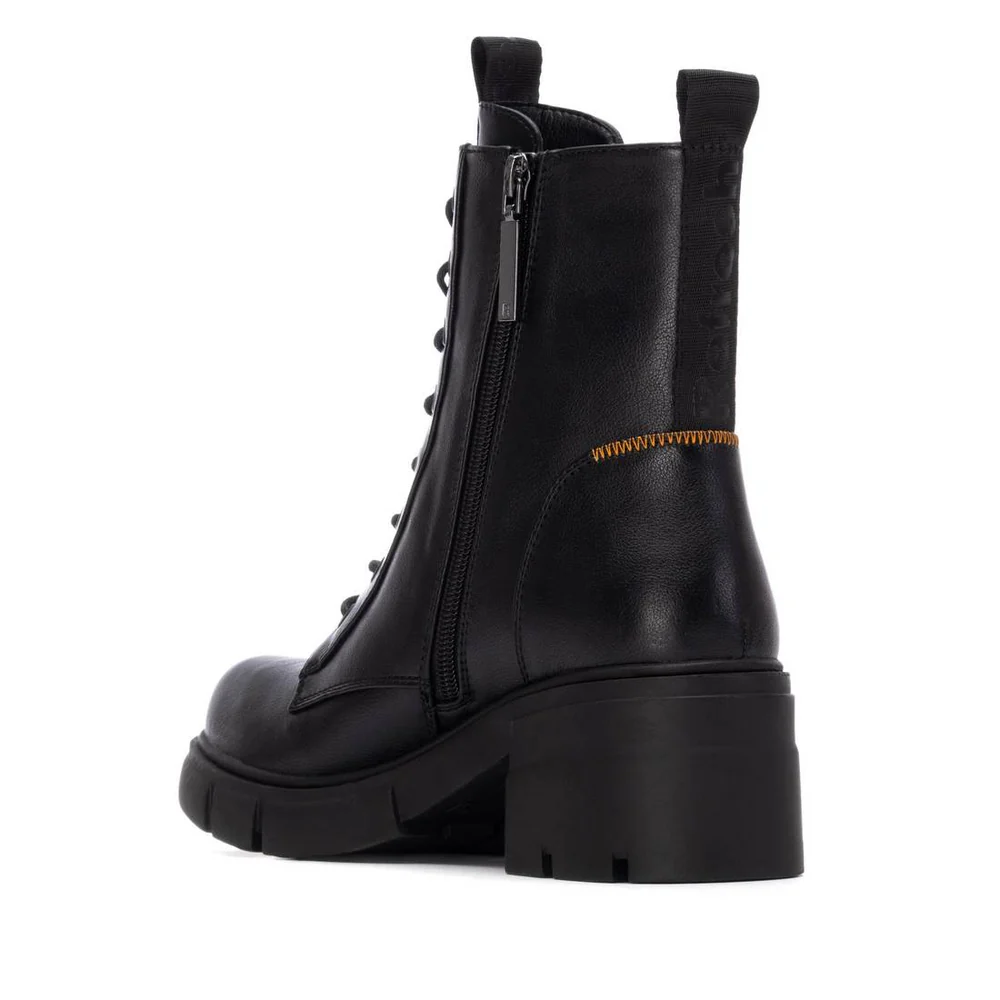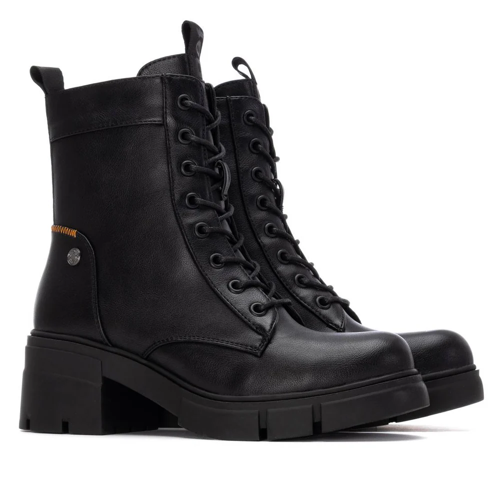 Botín de mujer, de la marca Refresh. Fabricado en material que imita a la piel. Pespunte naranja. Cierre mediante cremallera interior con cordones regulables para un mejor ajuste. Tirador delantero y trasera para facilitar la puesta. Tacón en bloque de 7 cm. Suela de goma antideslizante. Plantilla extraíble. Este modelo ha obtenido el certificado vegano por la organización mundial PETA (Organización de los derechos de los animales).